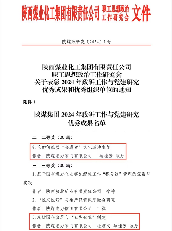 陜煤石電:2項(xiàng)政研成果獲集團(tuán)公司表彰